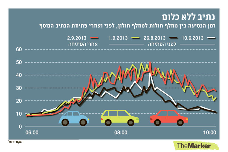 בדיקה שערך TheMarker בסיוע חברת דסל, המתמחה במידע על עומסי תנועה, מגלה כי זמני הנסיעה כלל לא התקצרו. השוואת זמן הנסיעה בכביש אתמול לזמן הנסיעה שלשום , ב-10 ביוני וב-26 באוגוסט מגלה שב-7:00 בבוקר, למשל, ארכה נסיעה בין מחלף חולות למחלף חולון 20 דקות - דקה יותר מאשר ביום ראשון שלפני הפתיחה. שבוע לפני כן נמשכה הנסיעה 17 דקות.