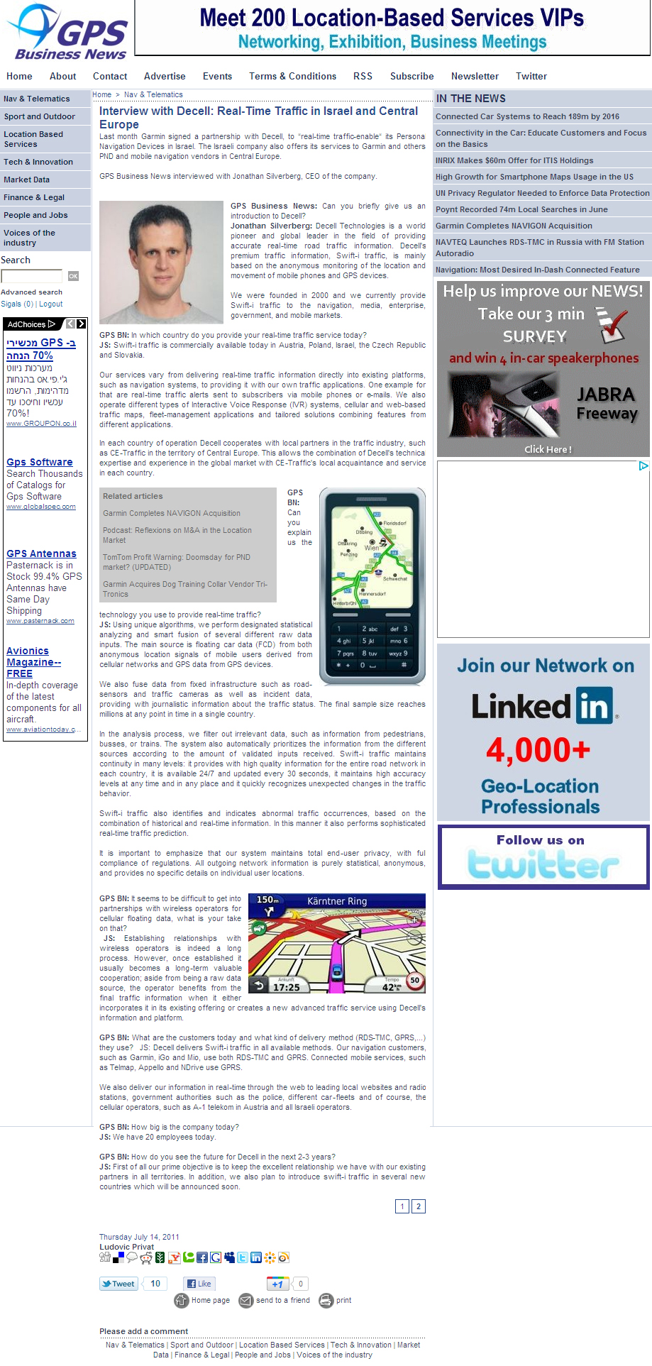 Jonathan Silverberg: Decell Technologies is a world pioneer and global leader in the field of providing accurate real-time road traffic information. Decell's premium traffic information, Swift-i traffic, is mainly based on the anonymous monitoring of the location and movement of mobile phones and GPS devices. We were founded in 2000 and we currently provide Swift-i traffic to the navigation, media, enterprise, government, and mobile markets.