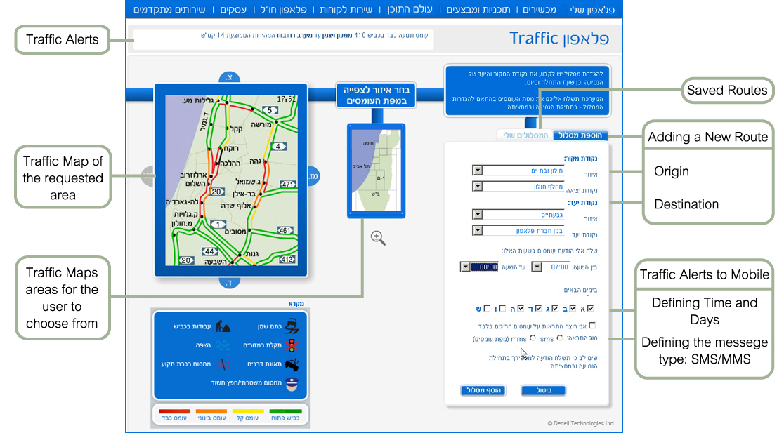 At the end of 2008, Pelephone and Decell introduced a completely new graphical platform to deliver real-time traffic information to subscribers under the Pelephone “Traffic” brand. Registered “Traffic” users can choose between three different channels of gaining access to the traffic information that is relevant to them at a specific point in time: receiving an MMS or SMS message with the relevant traffic information on their predefined route, though their phone’s Web browser, or through a regular Internet browser. In order to receive automatic traffic updates, users can set their preferences such as preferred routes and usual journey times in advance. The service then sends real-time traffic alerts relevant to this particular user in predefined times.